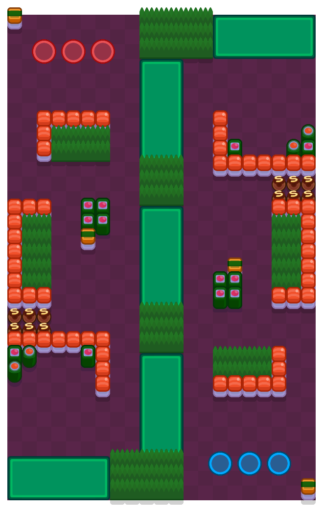 El mapa consta de solo dos carriles, ya que toda la zona central está cerrada por agua, con pequeños grupos de arbustos entre el agua que permiten el paso a los Brawlers. Cada carril tiene una delgada línea de muros con un grupo de arbustos encima. Hay muros a los lados, más adelante, que forman una C invertida con arbustos dentro de la curva. También hay algunos muros junto a la C. Al final de cada carril hay una L de muros lateral. El mapa es diagonalmente simétrico.