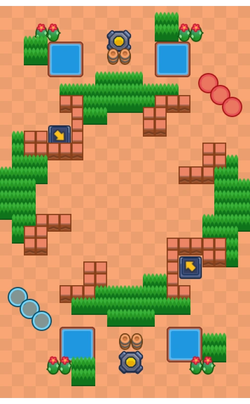 De kaart is diagonaal symmetrisch. Er zijn twee teleporters aan de randen van de kaart en twee lanceerplatforms omgeven door muren. Over het algemeen zijn er gebogen formaties van muren verspreid, met rijen en kolommen struiken tussen die muren. Het midden is volledig open. Er zijn twee kleine watermassa's en een klein aantal struiken en muren naast het water aan weerszijden van de teleporters.