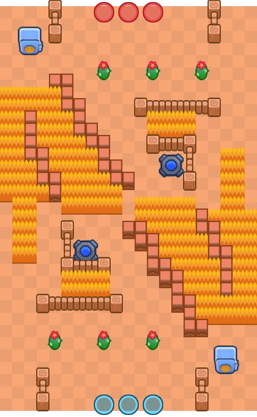 Сверху и снизу находятся точки возрождения бойцов, сейфы расположены в правом нижнем и левом верхнем углах. На карте много кустов, которые сопровождаются стенами. В центре карты есть телепорты. Перед точками возрождения бойцов несколько кактусов. Дизайн Каньона.