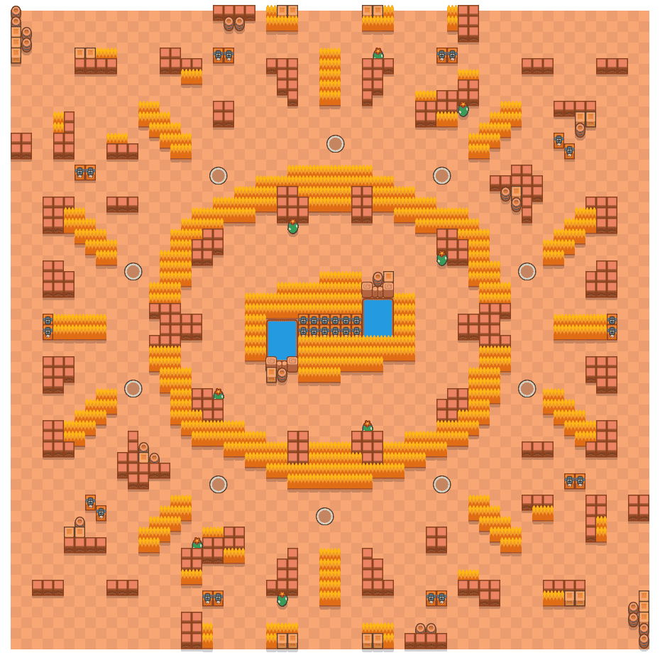 Эта карта похожа на солнце, или воронку. Карта достаточно закрытая, с множеством кустов и стен. В центре очень много кубиков усиления, а возле них есть небольшие водоёмы. Дизайн Дикого Запада.