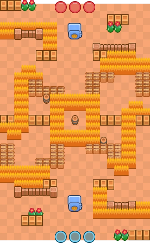 В центре располагается периметр из кустов, также довольно много ящиков и стенок. Посередине карты стоит бочка. Около точек появления стоят ящики с кактусами. Также возле них есть скопления кустов с забором. Дизайн Каньона.