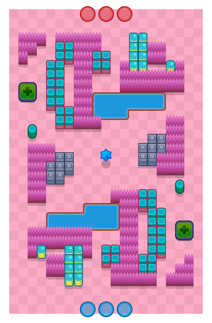 Карта достаточно открытая, есть много кустов, стен. В центре — синяя звезда, а по бокам неразрушимые стены, а возле кустов есть водоёмы. Дизайн — Велоцирапторпляж.
