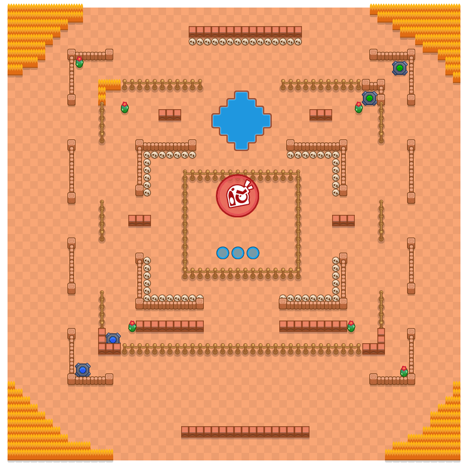 Спавн и босса, и игроков расположен внутри клетки из верёвочного забора. Сверху клетки есть водоём. В правом верхнем и в левом нижнем углах возле стен расположены телепорты. В левом верхнем углу есть пять кустов. В углах карты расположены кусты. Дизайн Каньона.