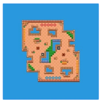 Данную карту визуально можно разделить на две части, которые отделяет конструкция из нерушимых стен, воды и небольшого прохода в кустах. Также по бокам расположены трамплины, которые позволяют быстро переместиться на "вражескую" территорию. Из-за подобного размещения и множества блоков и кустов игрокам легко удерживать свои шахты, но для победы всё же придётся атаковать противников.