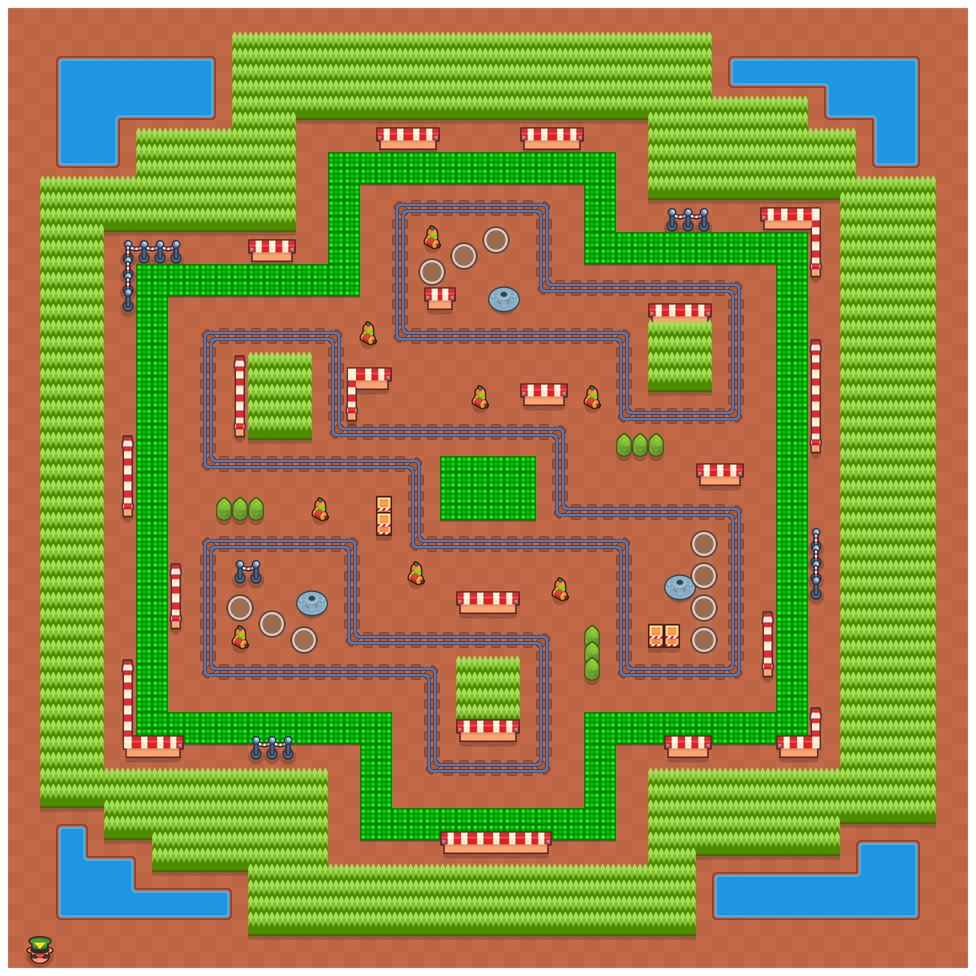 В центре карты находится большая область с ускоряющими плитами, а по углам — прямоугольные скопления кустов. По всей площади проходит железная дорога с поездом. Граница карты состоит из огибающей полосы из ускоряющих плит, окружённой полосой из кустов с четырмя озёрами с водой. Точки появления игроков и контрольные точки находятся сверху и снизу. Дизайн Subway Surfers.