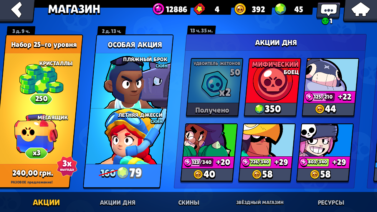 В этом разделе находятся: баннер покупки текущего сезона Brawl Pass до его окончания, подарки, различные предложения со скинами, бойцами, ресурсами, косметикой и т.д. по выгодной цене. В отличие от всего перечисленного ниже, которое обновляется в 11:00 по МСК, этот раздел, чаще всего, обновляется в 10:00 по МСК.
