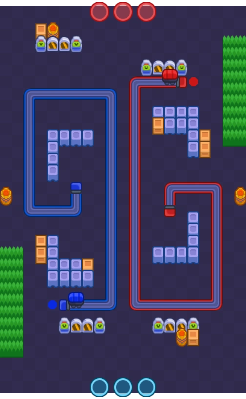 • По центру карты рельсы пересекаются, позволяя толкать и замедливать вагонетки одновременно.