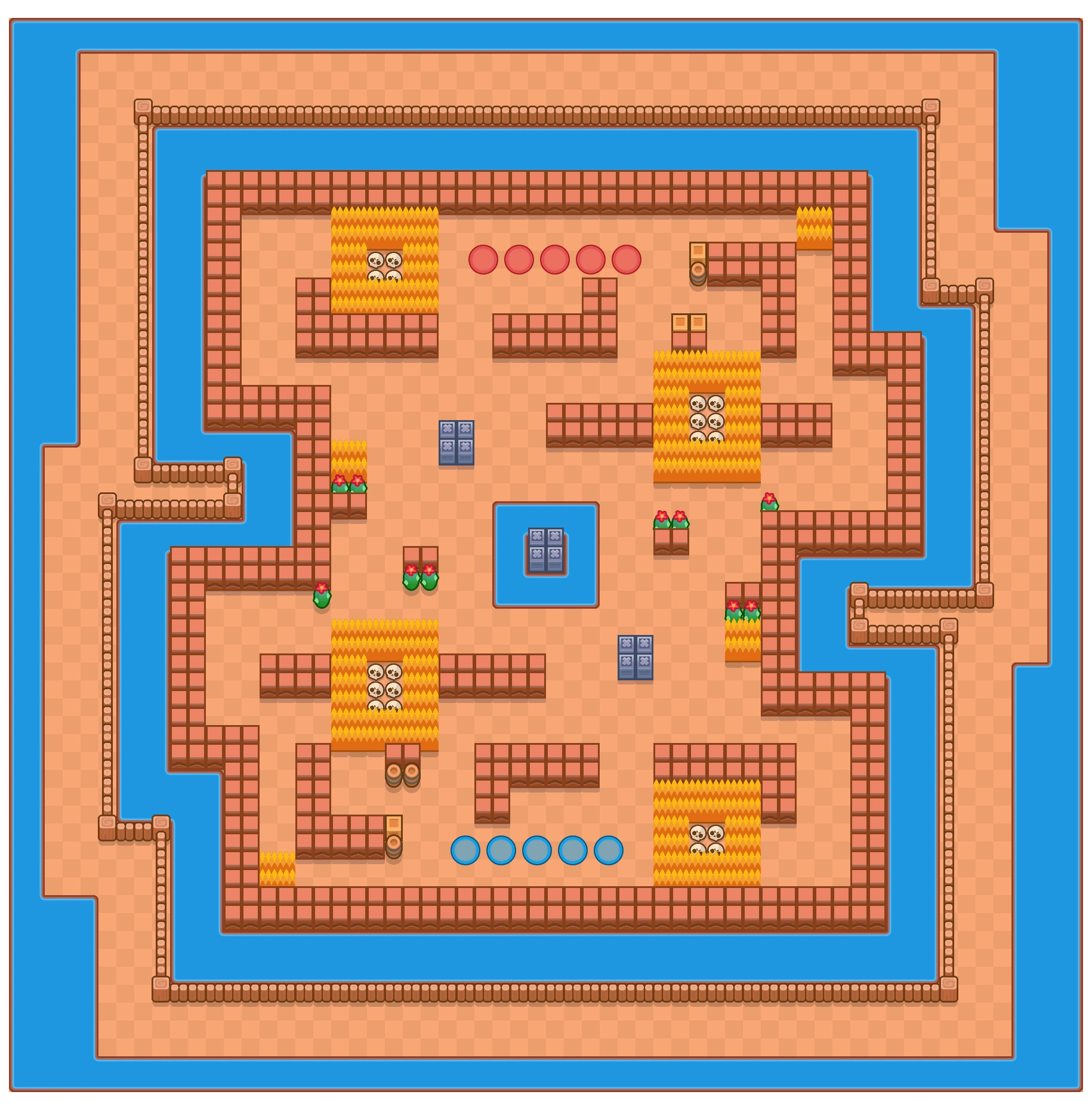 В самом центре карты располагаются небольшие неразрушаемые стены, окруженные водой. Немного дальше находятся еще одни неразрушаемые стены, а также обычные стены, кактусы и кусты. Дальше расположены большие стены и крупные кусты с черепами внутри, а также малые кусты. Возле них находится немного ящиков, бочек и точки возрождения бойцов. Дизайн Дикого Запада.