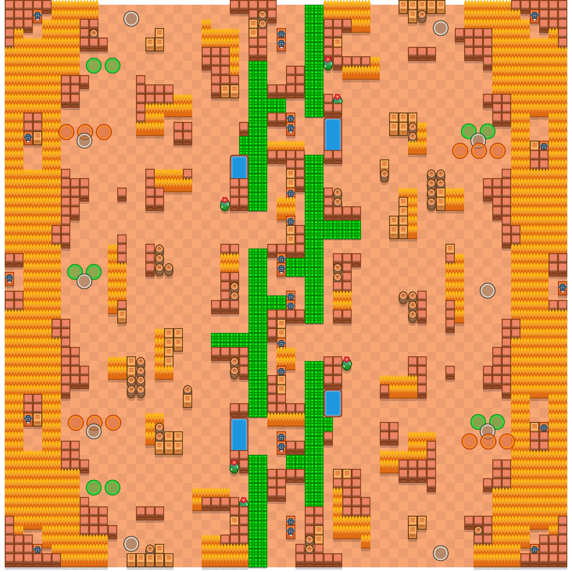 В центре карты находится большая вертикальная полоса с ящиками, состоящая из широких стен, плит усиления, озёр с водой и других блоков. Слева и справа располагаются гигантские пространства из кустов с ящиками. Между этими кустами и центрам находятся области с меньшим количество блоков и точками появления бойцов. Дизайн Дикого запада.