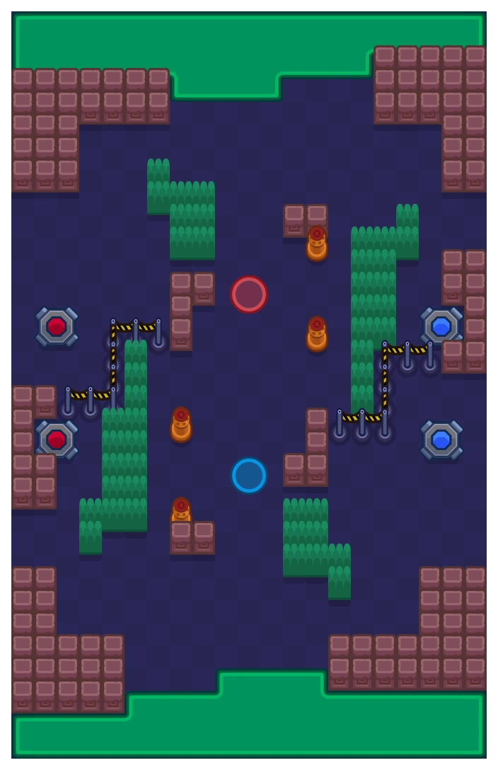 В центре карты находится пустая вертикальная область с точками появления бойцов. Слева и справа она окружена полосами из кустов, блоков и заборов. У краёв карты располагаются телепорты для быстрого перемещения по карте. Снизу и сверху находятся большие озёра с водой. Дизайн Океанариума.