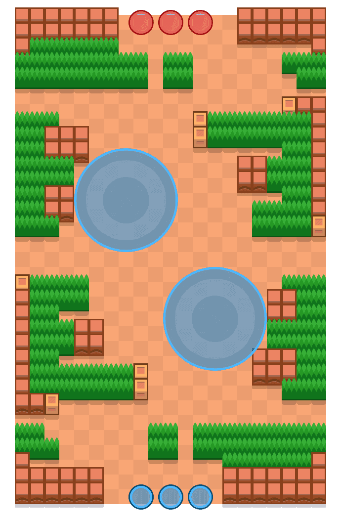 На карте есть две зоны, окруженные с двух сторон стенами и кустами. Сверху и снизу карты немного стен и кустов. Дизайн Каньон.