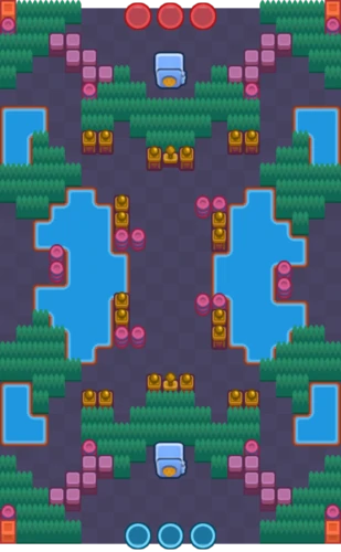 По краях мапи – точки відродження бійців, трохи далі – сейф. 20% мапи – вода. 25% – кущі. До ворожого сейфу можна дістатися лівим, правим флангом або центром. Лівий і правий фланг відділені водою, можна пробратися через кущі. Також на мапі є коробки, бочки та інші кущі. Дизайн двору замку.