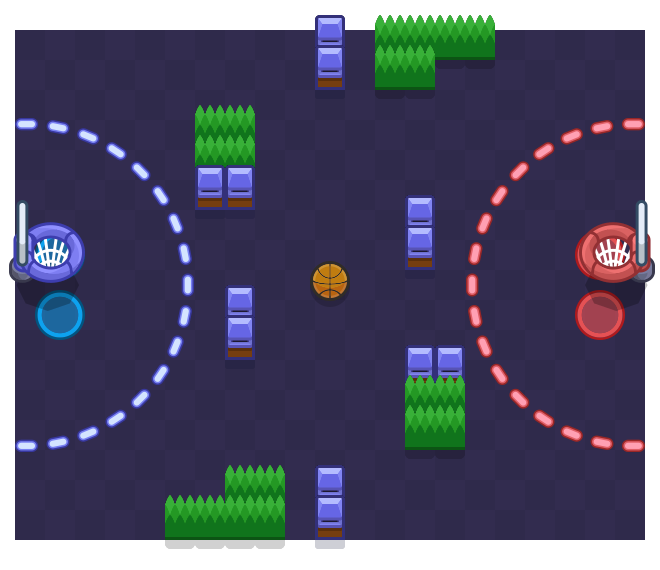 In front of spawn is a 1x2 wall formation. Next to it is a clump of bushes with walls on one side. On the other side of this center wall is a clump a bushes with walls near it. This map is symmetrical.