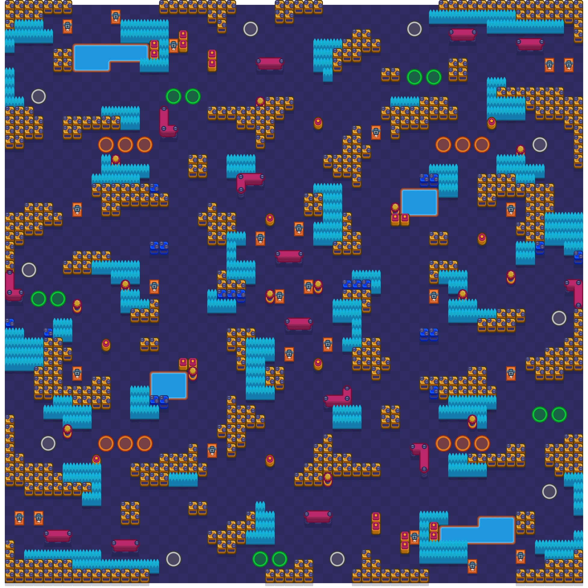 This is a dynamic battlefield with a circular design, featuring a mix of open spaces and tight corridors. The center is a high-risk, high-reward zone with Power Cubes, making it a hotspot for early fights. The outer areas provide more cover with walls and bushes, allowing for strategic positioning and ambushes. Players must balance aggression and patience, as controlling key areas can determine survival in the late game.