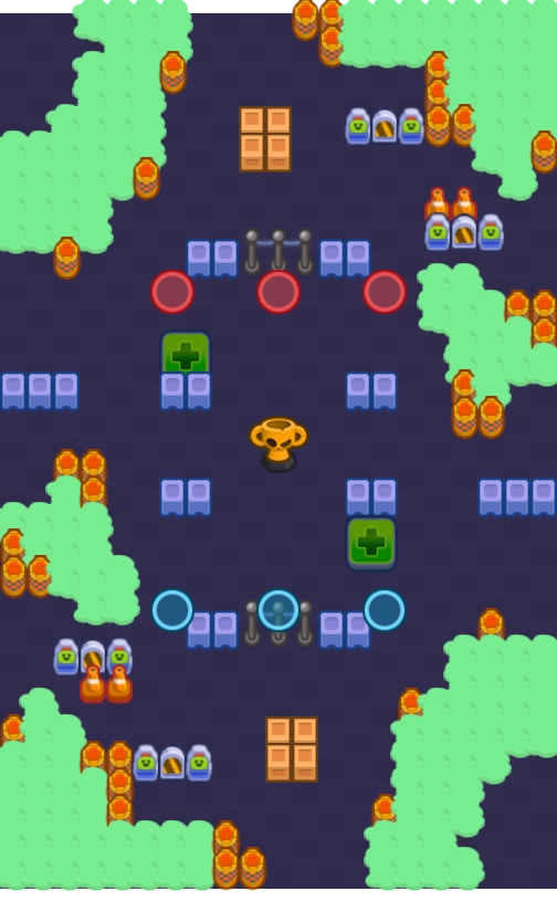 The map's center is blocked by rows of walls. In each team's corner is an open area with a poison gas ring and a poison gas cage in the opposite corner. The map features 2 healing pads near to the poison gas rings. The map is diagonally symmetrical.