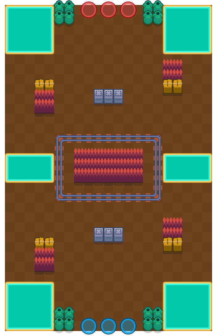 The map has 3 lakes on each side, some walls and some bushes at the beginning and a square full of spikes and bushes in the middle. The map is diagonally symmetrical.
