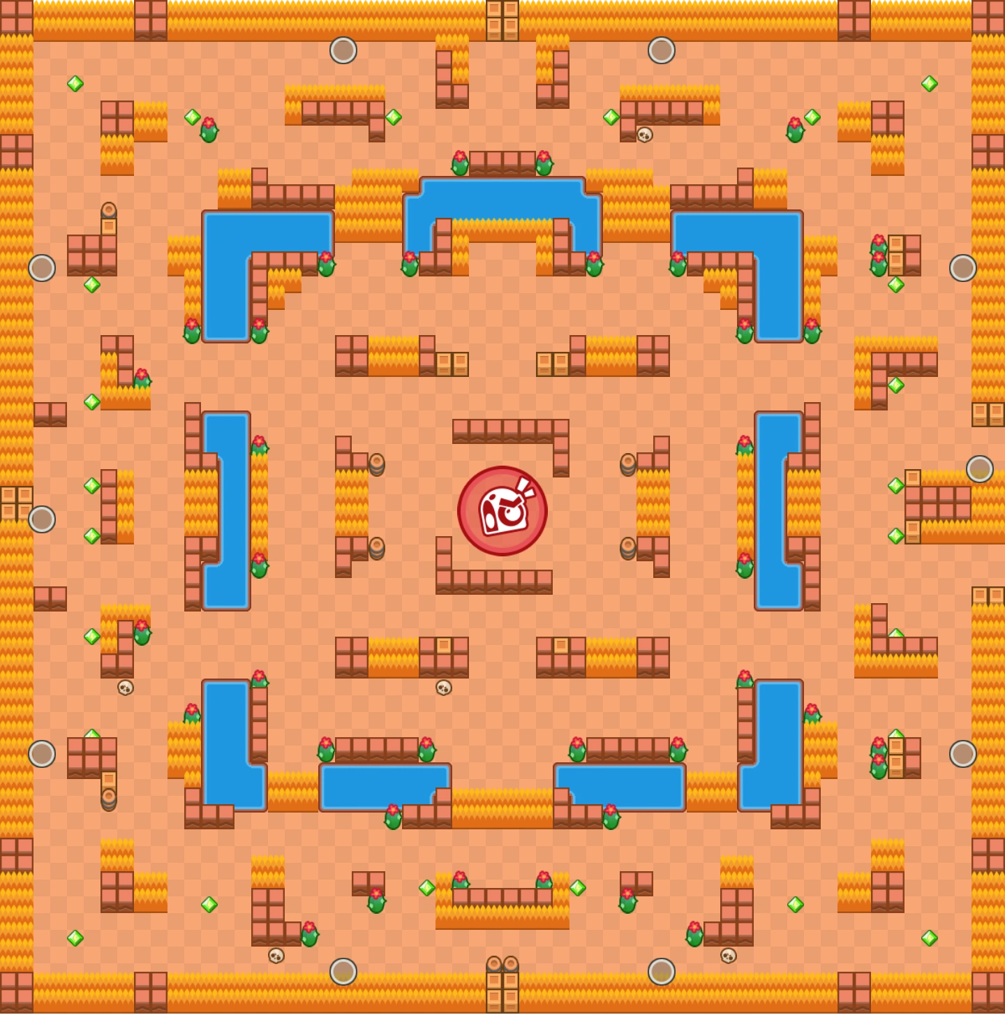 • The center is open with only two L-like walls blocking direct shots. Brawlers that do not have wide spread attacks should refrain from entering it.
