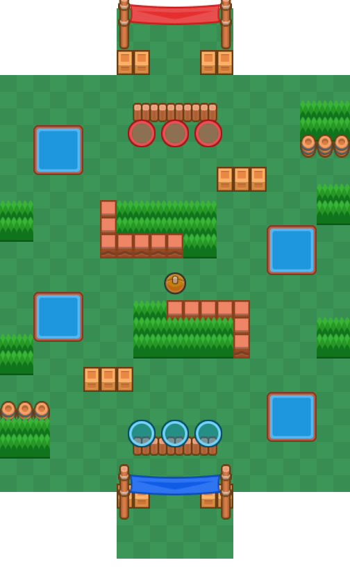 • The lakes block close-ranged Brawlers from attacking Brawlers directly. Sharpshooters like Colt, Rico, Piper, Nani, and Brock can shoot enemies in the central bushes without having to leave the lakes.