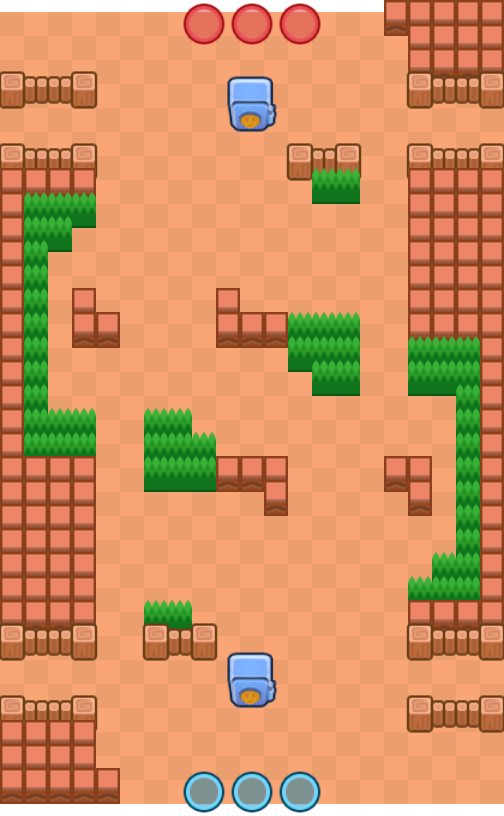 This map has a bunch of walls laid around the sidelines, making passageways narrow (lanes wise). The middle has little to no bushes, and is fairly narrow as well. The map is diagonally symmetrical.