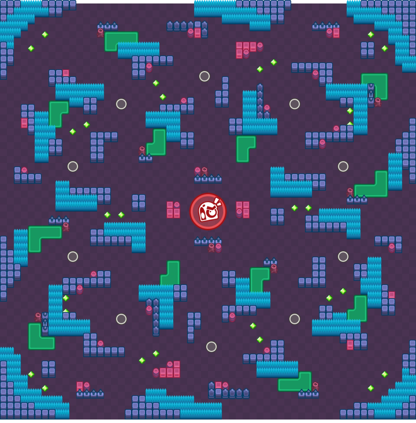 The map's spawn points are placed in a circle. The map features L-shaped bushes and L-shaped acid lakes but is otherwise relatively open and lacks cover. There are some fences around many lakes. At the edge of the map there are clusters of walls with bushes. The map is diagonally symmetrical.
