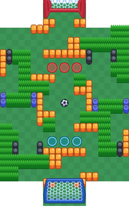 There are four long twisting bushes, two near the mid and two near the spawns. They are surrounded by some small to medium sized walls. In front of the goals there are large L-shaped walls splitting the entrances to two. The map is diagonally symmetrical.