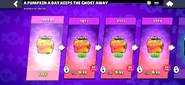 Pumpkin Boxes are a special type of Boxes introduced in the September 2025 update for the Trick or Treat Event. They were obtained by buying them for 99 Candies, and could be purchased with Gems. Pumpkin Boxes contain 10 drops. They can contain Coins, Power Points, Credits, XP Doublers, Gadgets, Star Powers, Hypercharges, new Brawlers, and Brawl-o-ween + related cosmetic: skins, Pins, Sprays, Profile Icons. Additionally, one of the Brawl-o-ween 2025 skins might occasionally jumpscare the player with each tap on the screen.