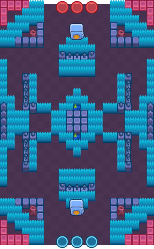• Throwers like Barley, Tick, Grom, Sprout, and Dynamike can attack the safe from the bushes in front of it. Keep track of the bushes on the side when choosing this route as an opposing team heavyweight such as Bull, El Primo, Rosa, and Darryl may sneak up from around the corner and go into nearby bushes.